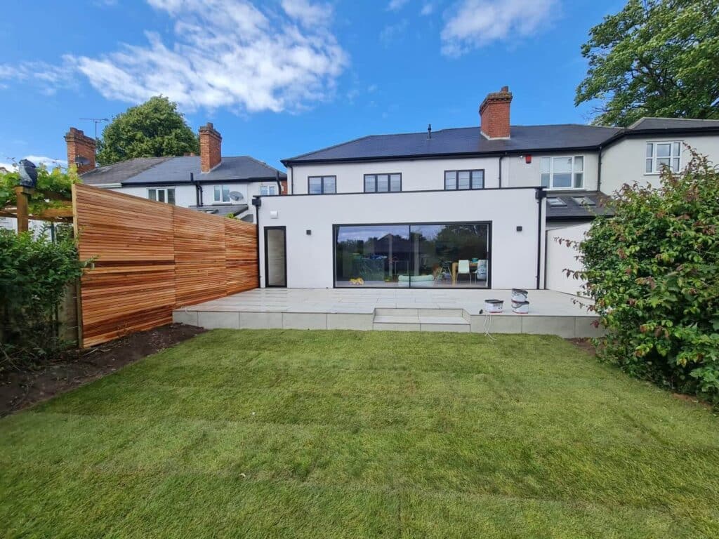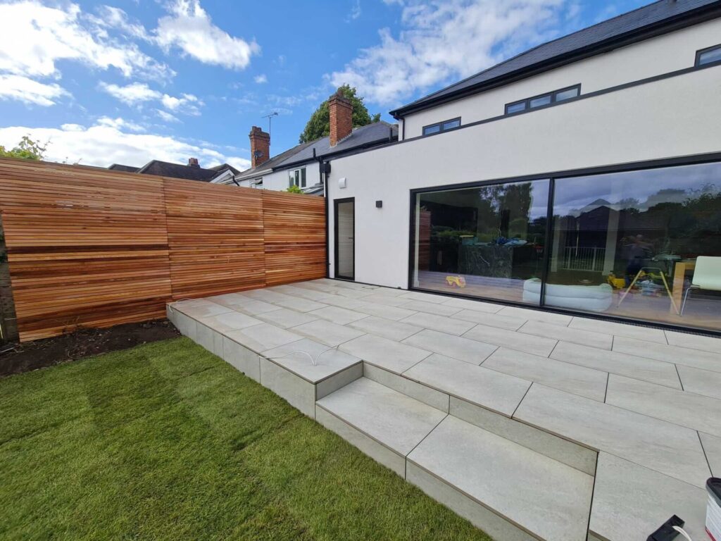 Modern Designs installed a sleek porcelain patio to create a durable and elegant seating area, perfect for entertaining. To add warmth and privacy, bespoke cedar fencing was fitted along one boundary. The garden was then finished with a fresh new lawn, bringing colour and softness to the design.